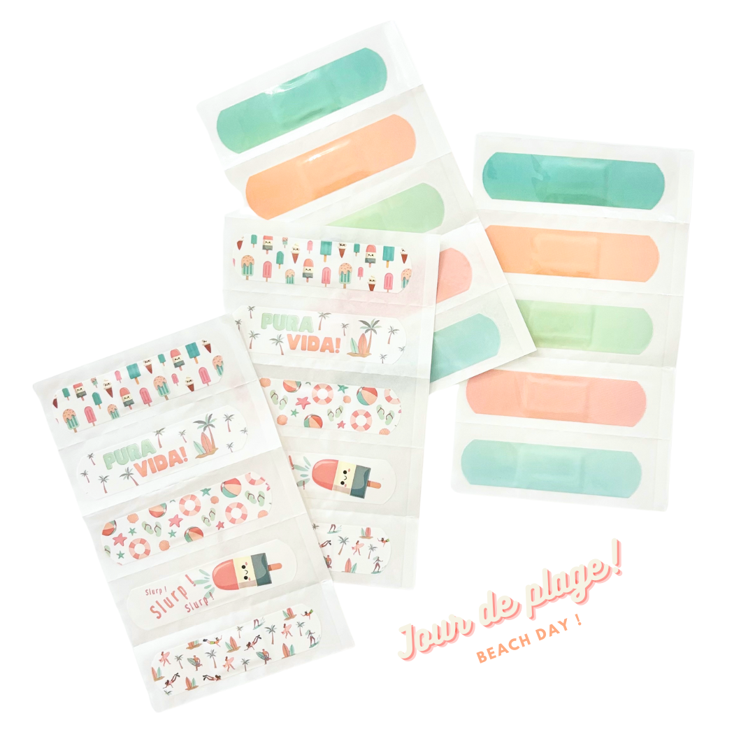 -2 paquets de Pansements ludiques : Un modèle "À la plage" et un modèle "À l'aventure" : Idéal pour ajouter une touche de plaisir quand un bobo survit à nos petits aventuriers !